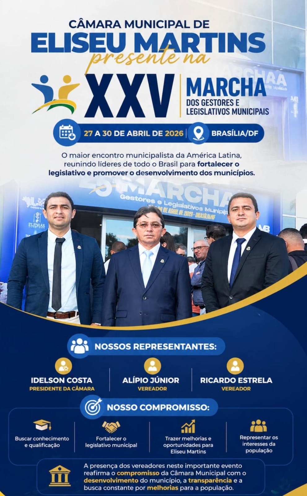 A Câmara Municipal de Eliseu Martins informa a realização de Sessões Ordinárias nos dias 23 e 24 de abril de 2026, a partir das 9h, na sede do Poder Legislativo.