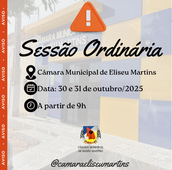 A Câmara Municipal de Eliseu Martins convoca a população para acompanhar as Sessões Ordinárias que ocorrerão nos dias 30 e 31 de outubro de 2025, a partir das 9h, no plenário da Casa Legislativa.